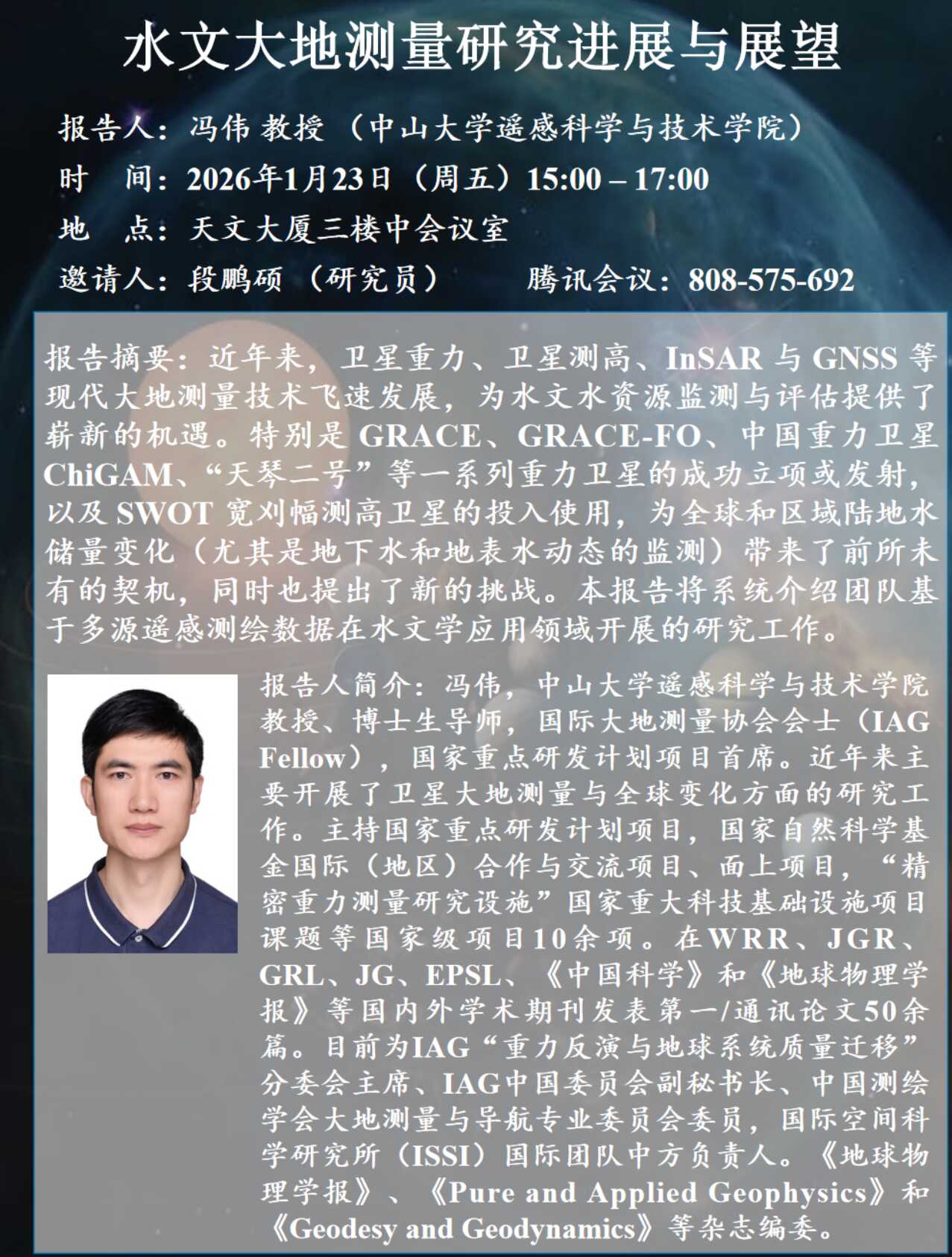报告人简介:冯伟,中山大学遥感科学与技术学院教授、博士生导师,国际大地测量协会会士(IAG Fellow),国家重点研发计划项目首席。近年来主要开展了卫星大地测量与全球变化方面的研究工作。主持国家重点研发计划项目,国家自然科学基金国际(地区)合作与交流项目、面上项目,“精密重力测量研究设施”国家重大科技基础设施项目课题等国家级项目10余项。在WRR、JGR、GRL、JG、EPSL、《中国科学》和《地球物理学报》等国内外学术期刊发表第一/通讯论文50余篇。目前为IAG“重力反演与地球系统质量迁移”分委会主席、IAG中国委员会副秘书长、中国测绘学会大地测量与导航专业委员会委员,国际空间科学研究所(ISSI)国际团队中方负责人。《地球物理学报》、《Pure and Applied Geophysics》和《Geodesy and Geodynamics》等杂志编委。